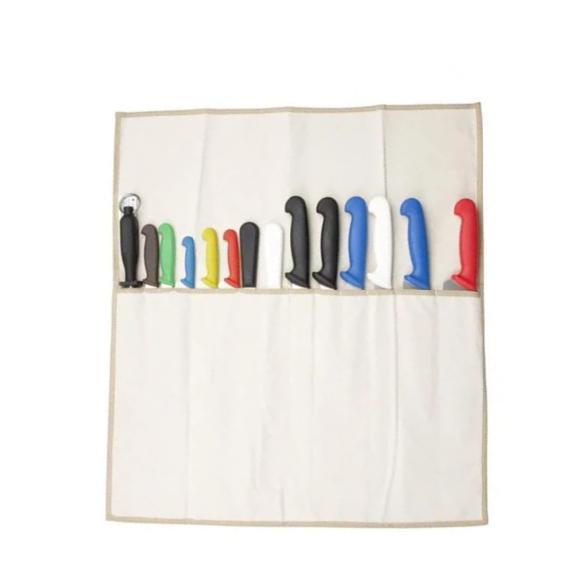 This knife wallet features a simple canvas design for safe and convenient knife storage. This wallet features fourteen compartments which are ideal for safely holding a variety of different sized knives with different blade widths. The knife wallet allows for the safe and practical storage and transport of chef knives. (supplied empty).